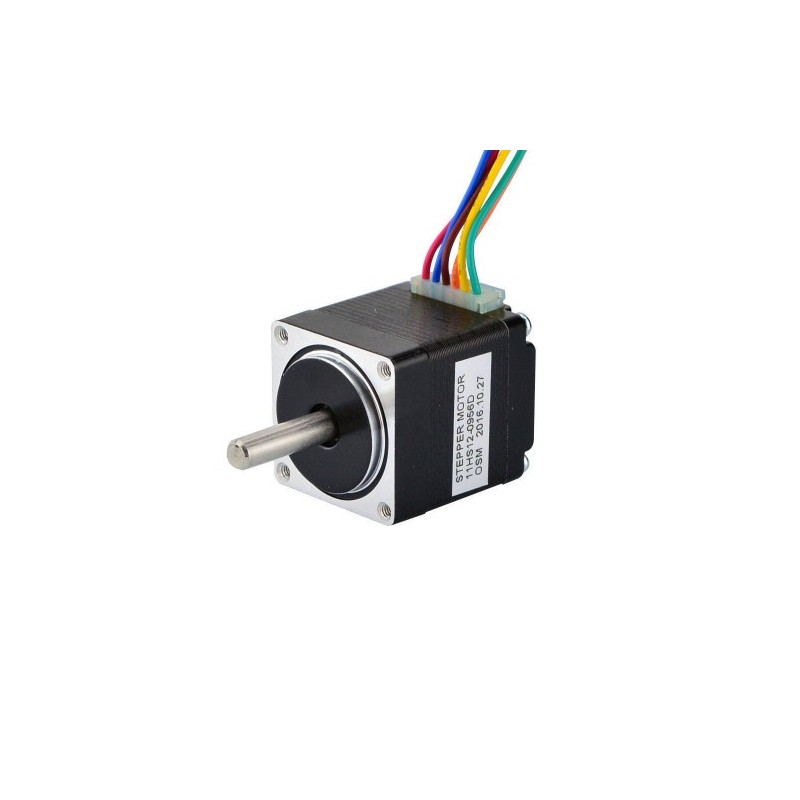 Este motor paso a paso unipolar con un ángulo de paso de 1,8 grados y un tamaño de 28x28x31,5 mm, Tiene 6 cables, cada fase consume 0,95 A a 2,66 V, con un par de retención de 4,3 Ncm (6,1 oz.in). Un eje trasero de 10mm era para encoder o igual.